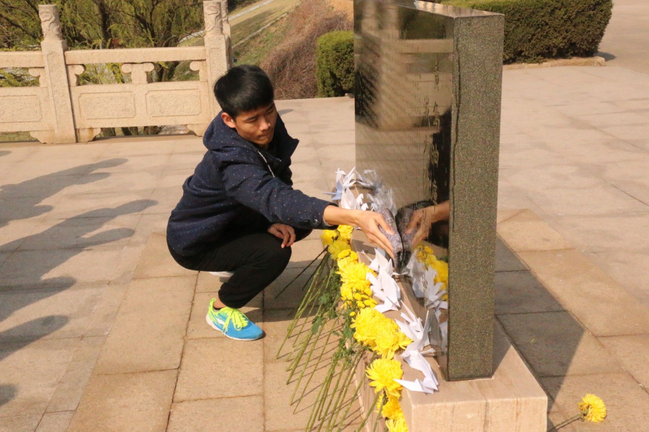 同学们仔细擦拭纪念碑,