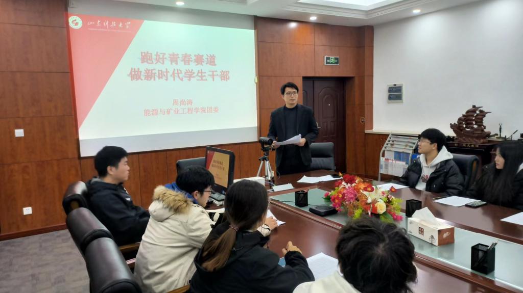 11月28日,能源美女自慰 举行了“跑好青春赛道”主题团课培训活动。团委书记周尚涛以及各部门主要学生干部出席了本次活动。