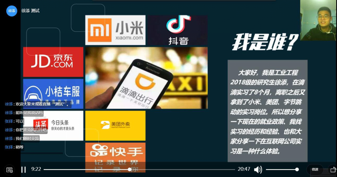 徐添曾获得滴滴、小米、字节跳动等多家互联网公司的就业实习机会,分享会中他结合个人寻找实习的经历和经验为同学们做交流分享。