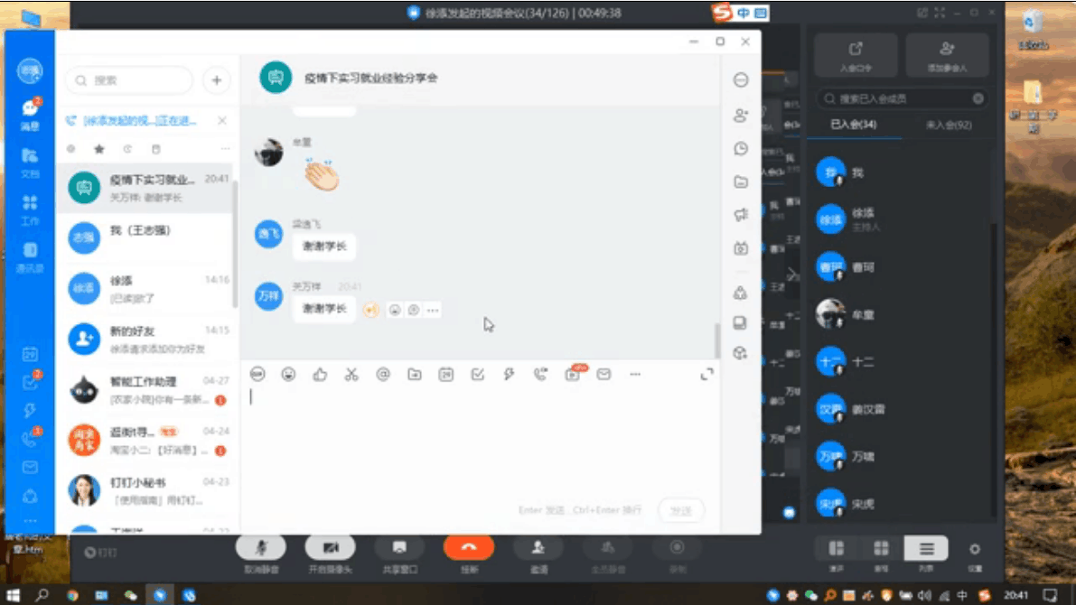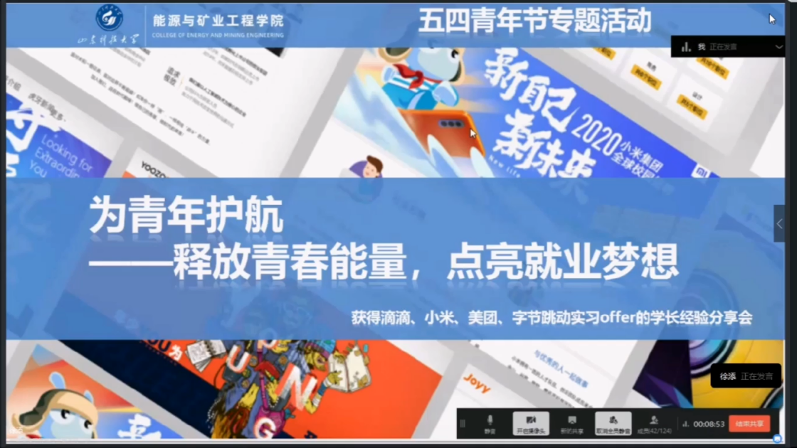 利用腾讯会议平台开展五四专题:为青年护航——释放青春能量,点亮就业梦想分享会。硕研18-2班研究生徐添担任主讲人,美女自慰