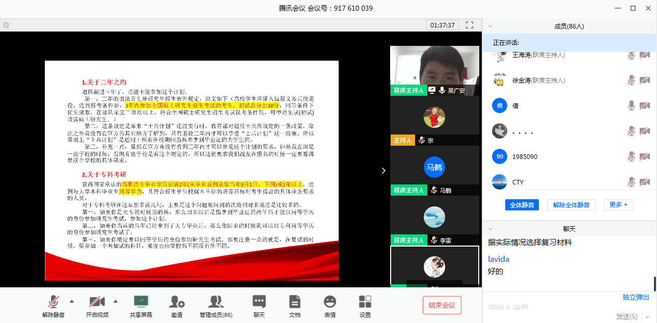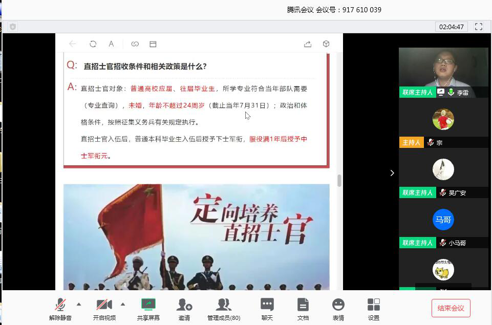 本次活动利用腾讯会议平台举行,宗彩建老师首先对四位同学和参会老师进行了介绍,对老师和同学们的积极参与表示感谢。四位同学表示感谢母校母院的培养,正是因为经过矿院精神的熏陶,使自己更快的适应军队文化,他们分享了在部队的点点滴滴,并分别从军人待遇、大学生参军入伍优惠政策、在部队成长路线、退役安排等方面为在场同学进行解读答疑,勉励有志入伍的同学,要坚定初衷,矢志报效国家。