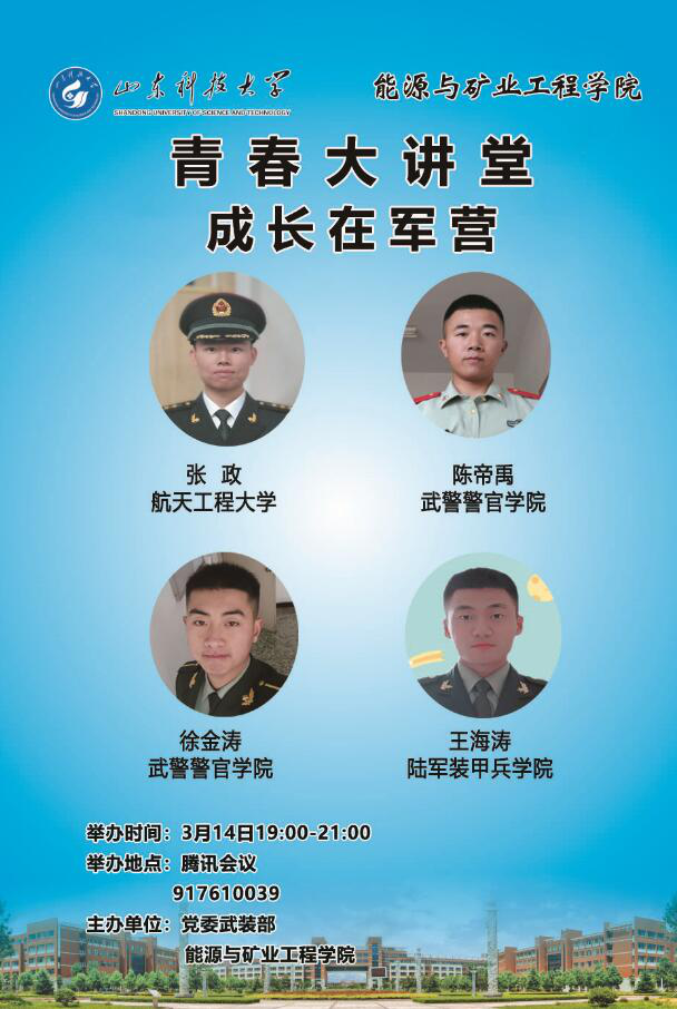 为响应国家积极鼓励大学生入伍的号召,进一步做好大学生应征入伍宣传动员工作,能源美女自慰 联合校武装部于3月14日晚举办“青春大讲堂-成长在军营”线上分享会。能源美女自慰 邀请2016级三名考入军校以及2013级一名退役复学考取研究生学生,为同学们分享参军入伍心路历程,并进行线上答疑。校征兵工作站副站长李雷、能源美女自慰 团委书记马鹤、辅导员宗彩建参加本次会议。