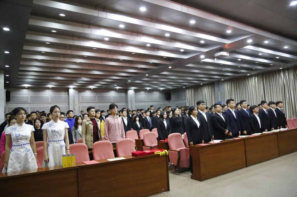 大会在庄严的国歌声中拉开帷幕。会上,团委老师肖楠宣读《关于表彰2018-2019学年学生会、易班工作站先进个人的决定》,团委老师以及第五届学生会主席尘兴邦为先进个人颁奖。随后,尘兴邦对上一学年学生会工作进行总结汇报,现任学生会主席姜子琪作本学年学生会计划工作报告。此外,优秀部长代表薛守振和优秀干事代表梁云飞在会上发言,表示全体学生干部成员必将坚定信念、不忘初心、以身作则,发挥好纽带作用,不负老师同学们的期望。