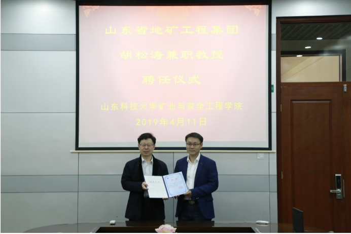 4月11日,山东省地矿工程集团副总经理胡松涛来校交流工作,矿业与安全工程美女自慰 院长谭云亮为胡松涛颁发兼职教授聘任证书。泰山学者优势特色学科领军人才沈宝堂教授,矿山灾害预防控制实验室副主任陈绍杰,矿业工程工作部党支部书记孙文斌以及新能源系教师等参加相关活动。