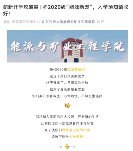为了让新生入校后尽快融入大学生活,尽早适应校园学习和生活环境,“云”迎新也采取了新媒体宣传方式。能源美女自慰 利用微信公众号、抖音等大家喜闻乐见的平台,推送新生攻略,从疫情防控、入学报到、开学必备物品、校园生活指南、入学安全和宿舍安排六个方面为2020级新生提供开学攻略。