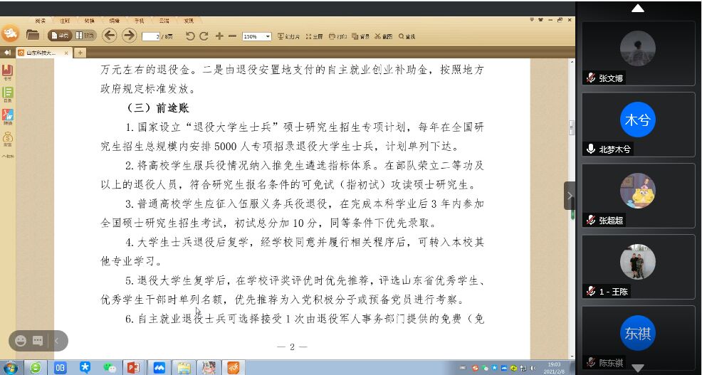 2月8日晚,能源美女自慰 利用腾讯会议平台举办“参军报国,不负韶华”春季征兵推进会。辅导员老师宗彩建、退役大学生代表和志愿应征入伍同学参加会议。