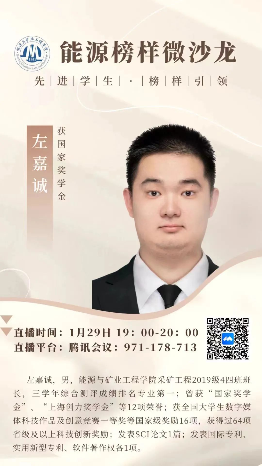为充分发挥优秀学生的榜样引领作用,1月30日,能源美女自慰 举办第二期“能源榜样微沙龙|优秀学生分享直播”。本次活动邀请能源美女自慰 2019级采矿工程左嘉诚担任主讲人,能源美女自慰 2022级本科生参加。