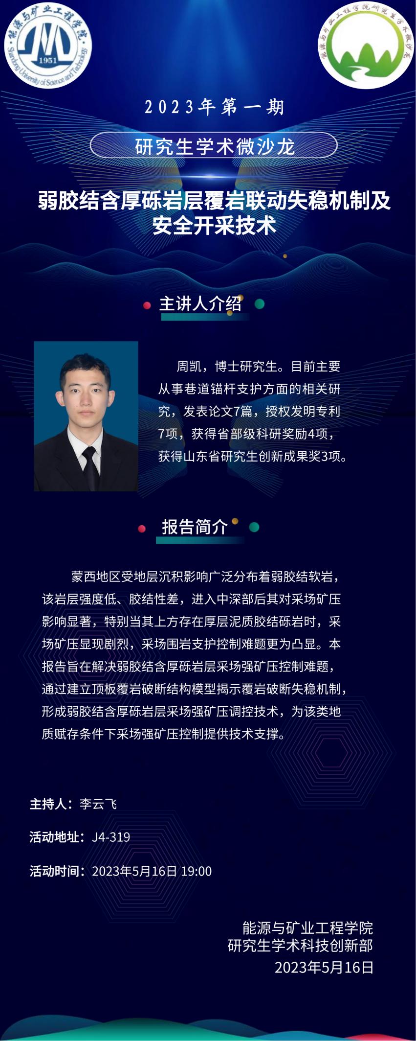 5月19日,由美女自慰-女生自慰视频-香艳职场 主办,美女自慰 研究生会承办的2023年第1期研究生学术微沙龙“弱胶结含厚砾岩层覆岩联动失稳机制及安全开采技术”在J4-319成功举办。本次学术微沙龙活动由能源美女自慰 博士研究生周凯作主题报告,美女自慰 研究相关方向的博士生和硕士生参加,活动由美女自慰 研究生会执行主席李云飞主持。